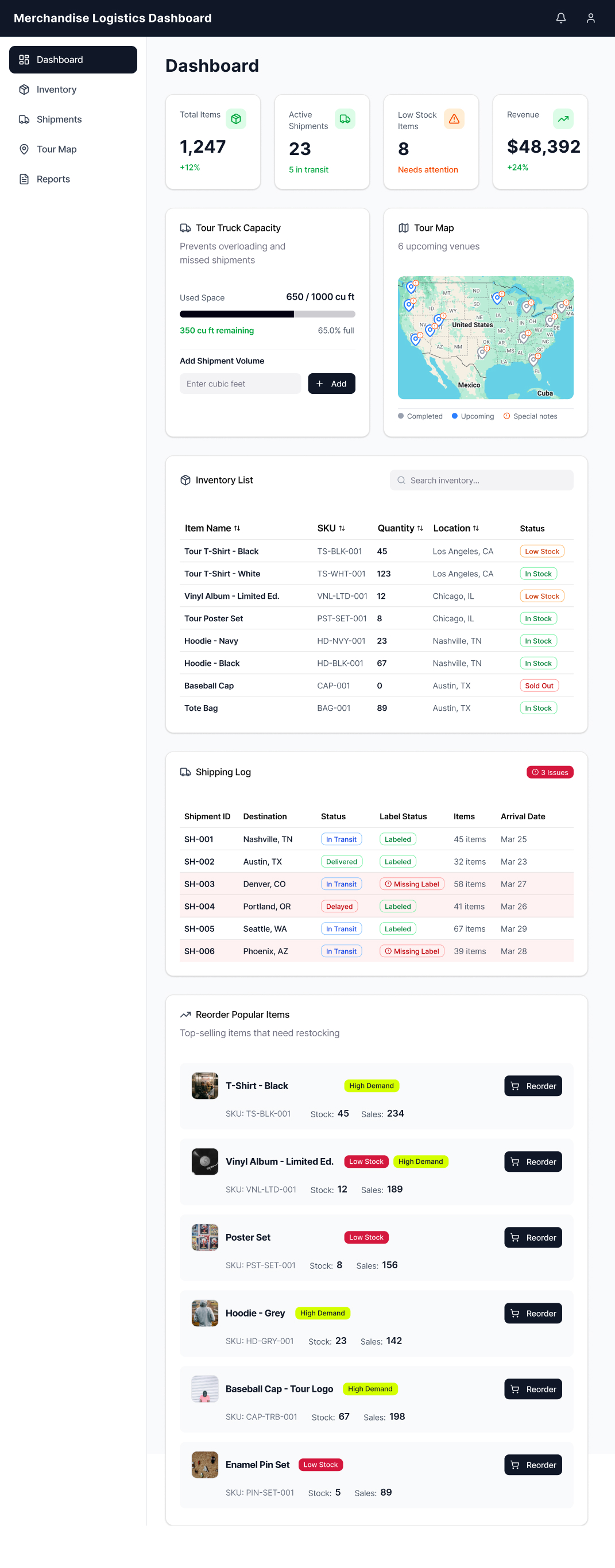 Design a dashboard that centralizes operations, increases visibility, and helps merch teams make quick, confident decisions while on tour.